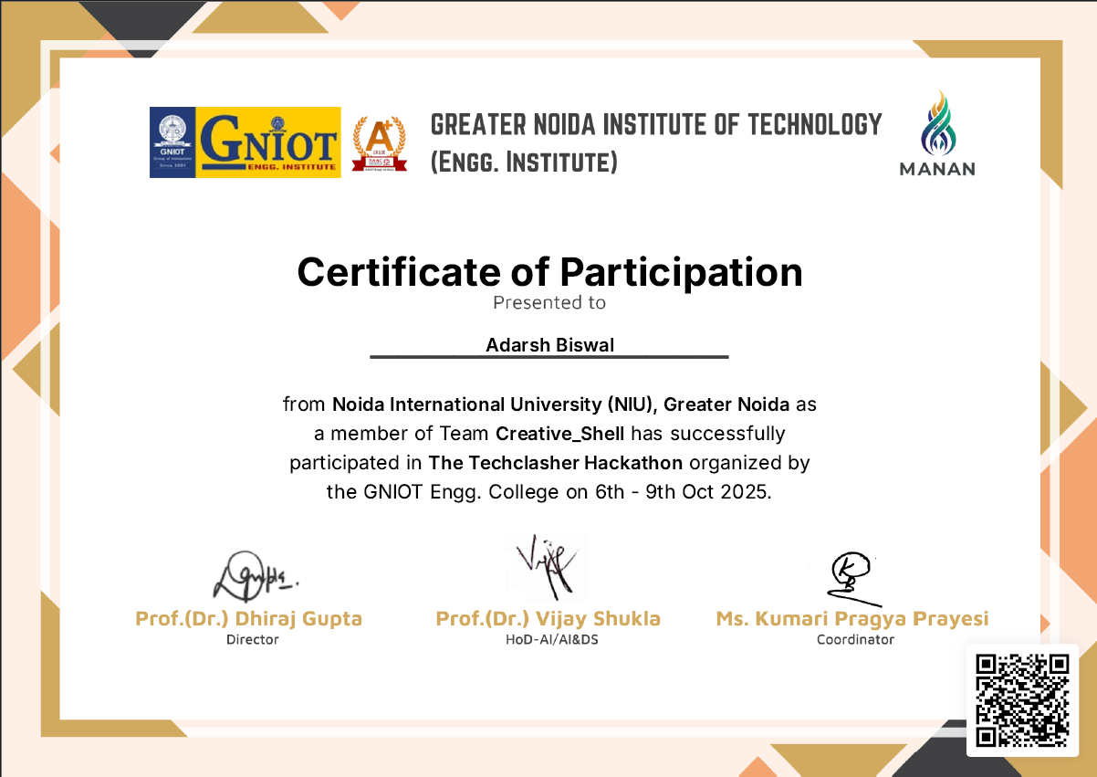 Achieved Top 50 position in the prestigious TechClasher Hackathon at GNIOT Engineering College, competing among hundreds of participants.