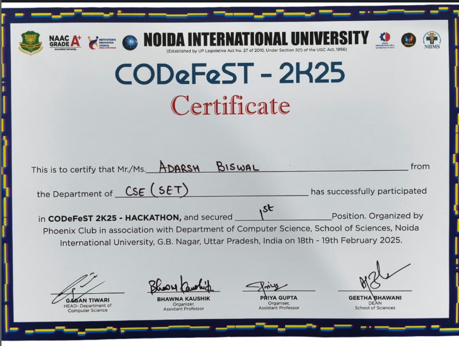 Secured 1st position in the university hackathon, demonstrating innovative problem-solving and technical excellence.